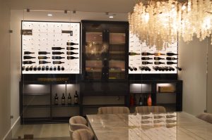 - To complete the modern and contemporary look, the wine cellar designer’s team installed triple-deep brushed metal wine pegs.